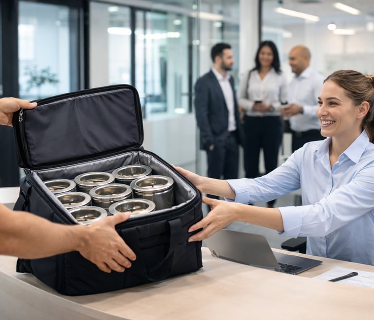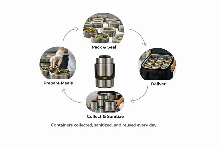 Meals are delivered in reusable thermal containers that keep food fresh while reducing waste.